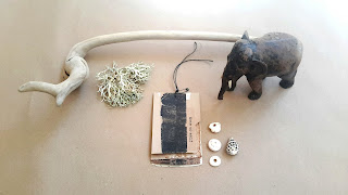 I have been enjoying the art of still life. I use things I have gathered from nature, small collage, mail art and some relics from my family. The elephant was a souvenir my Dad picked up in WWII as a gift for his Mom. I cherish it with its handmade personality and wabi sabi appearance. In my mind's eye I see it sitting on a glass shelf in the corner of the kitchen. I can almost smell cooking applesauce.